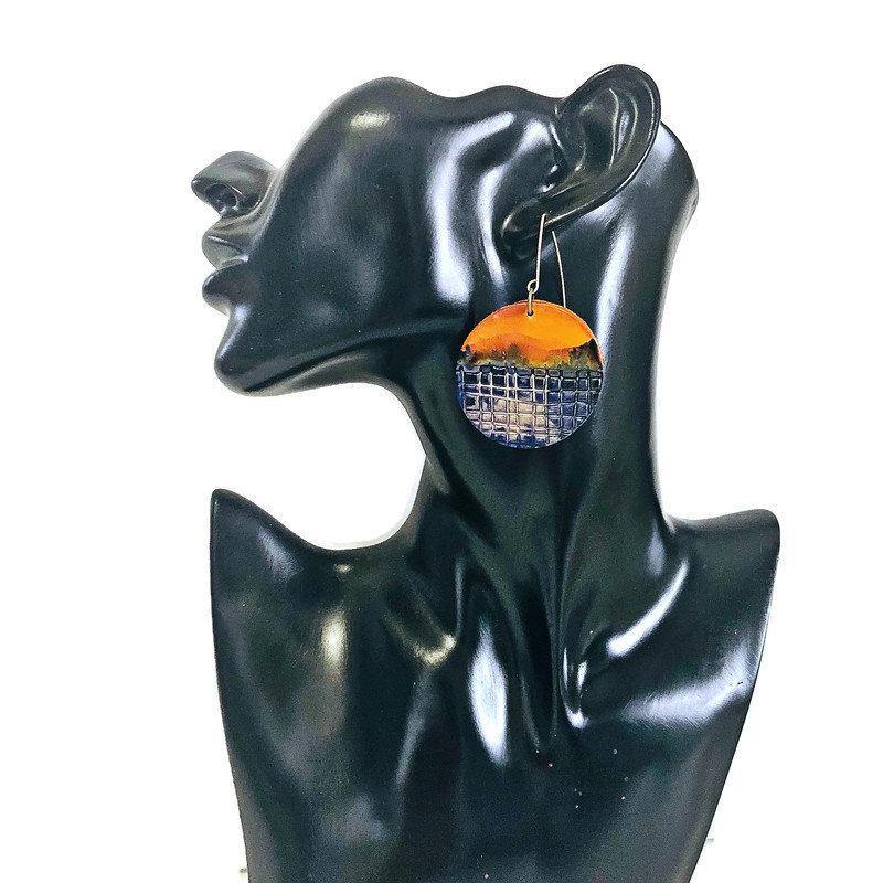 These large disc earrings were handmade from polymer clay and hand painted with alcohol ink. The bottom section has a textured style adding depth and making a statement.