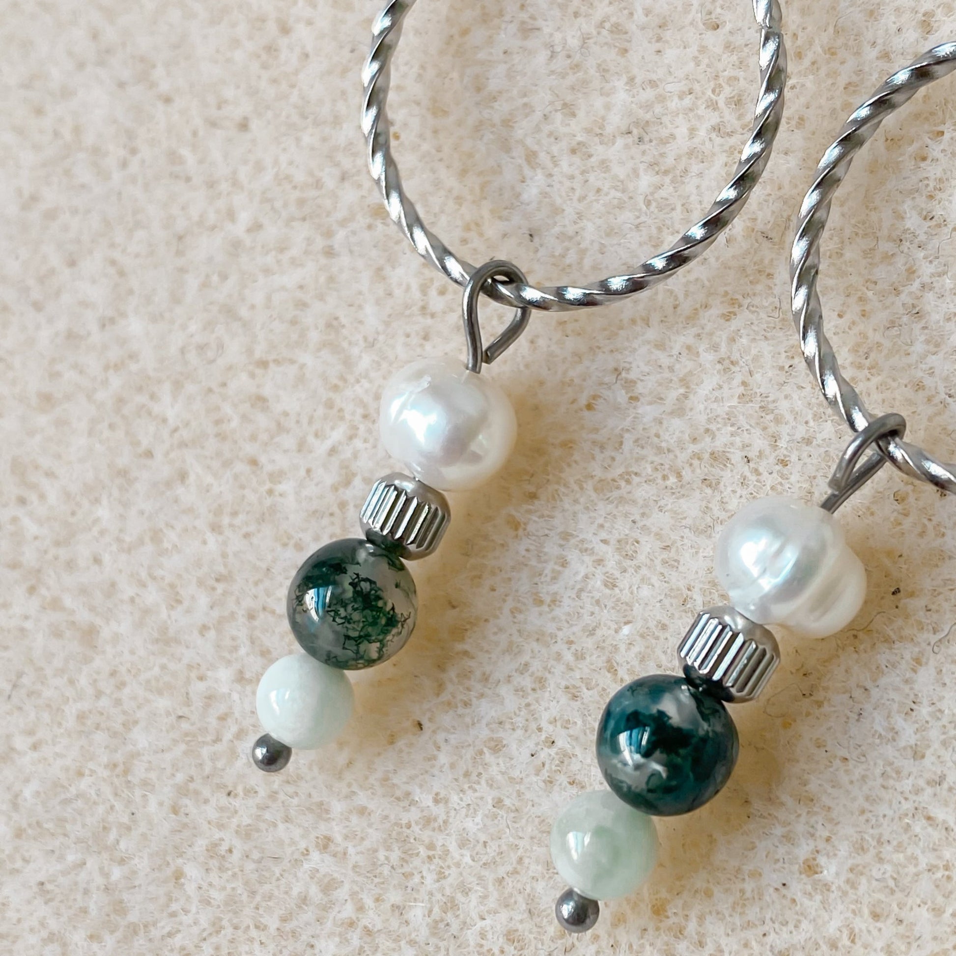 Chaque pierre choisie dans ces boucles reflète un fragment de cette force naturelle : la douceur blanche de la perle d’eau douce, l'aspect organique de l’agate mousse, et les nuances vertes apaisantes du jade maotien.