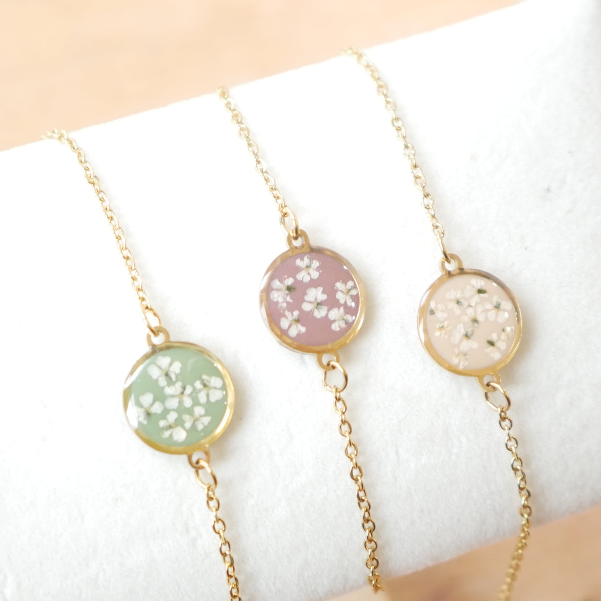 Bracelet en résine incrustée de fleurs de carottes séchées. Léger et délicat !
