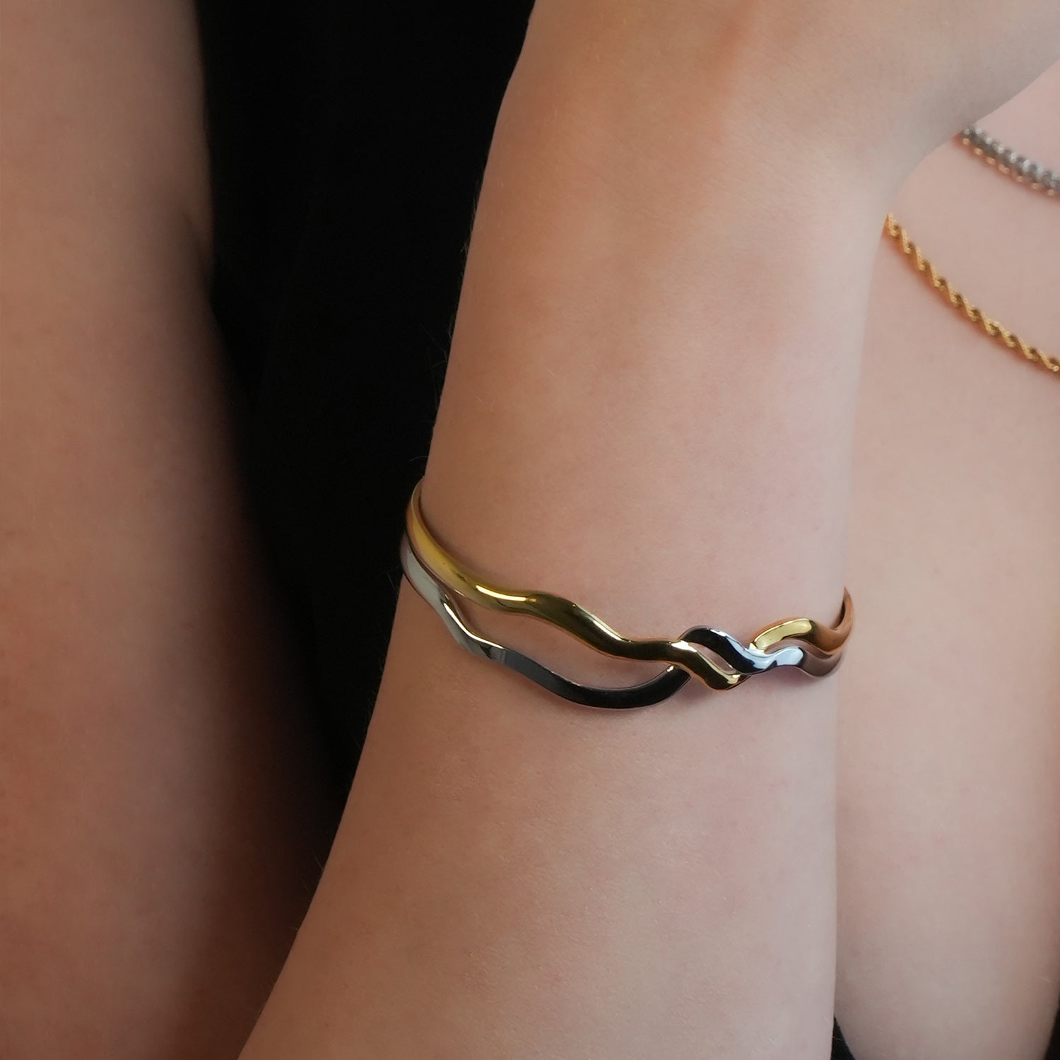 Upgrade your accessory game with our stunning Mixed Metals Bracelet. This is perfect for those who love minimalistic designs with a contemporary edge. Crafted with precision, the contrast in the gold & silver hoops dds an eye catching aesthetic to any outfit.