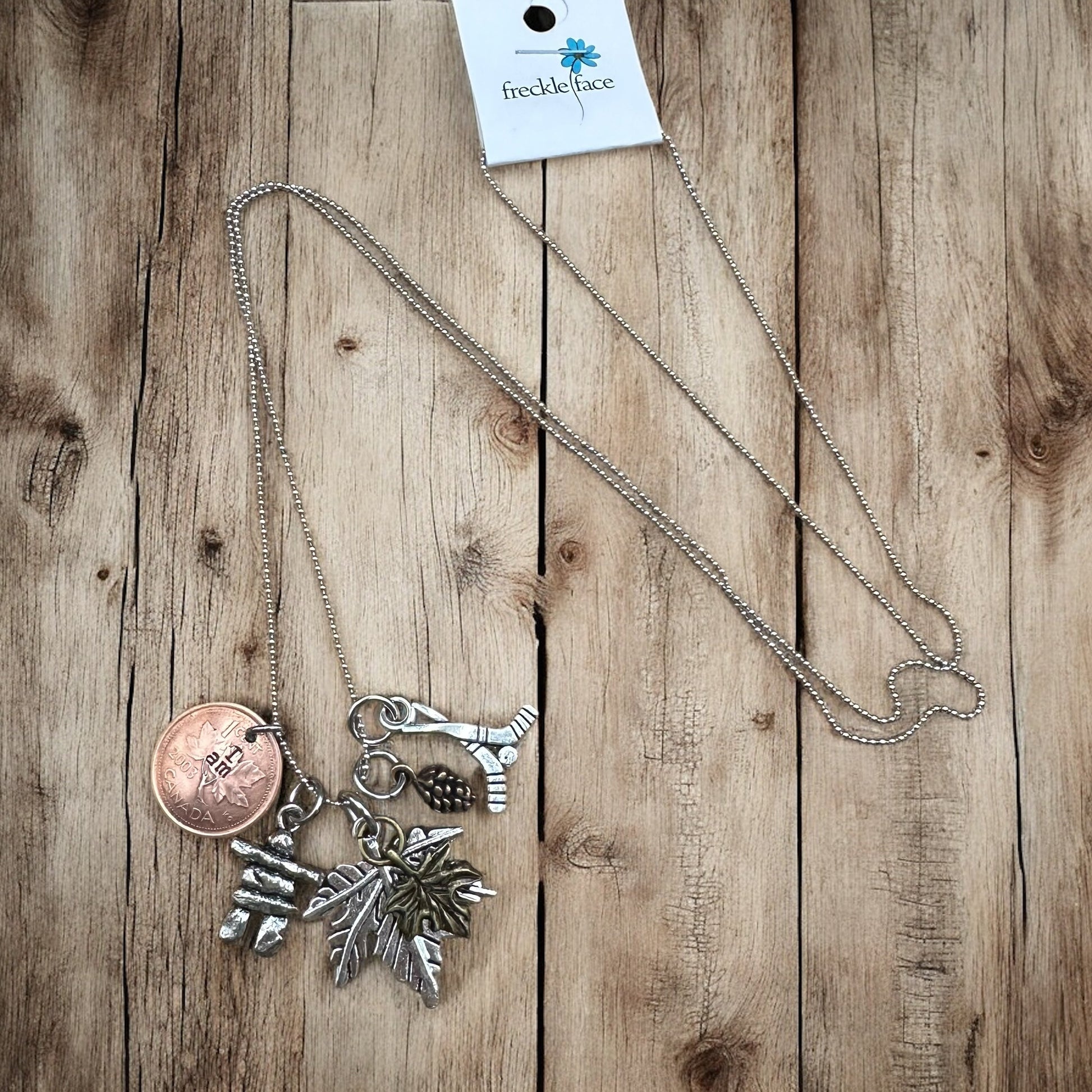 This necklace features a genuine Canadian penny pendant, hand-stamped with "I am" on the front, paired with two maple leaf charms, an inukshuk, a tiny pinecone, and your choice of either a Hockey or Moose charm. The pendant is suspended from a 30" stainless steel tiny ball chain, offering a vintage look with a patriotic flair.