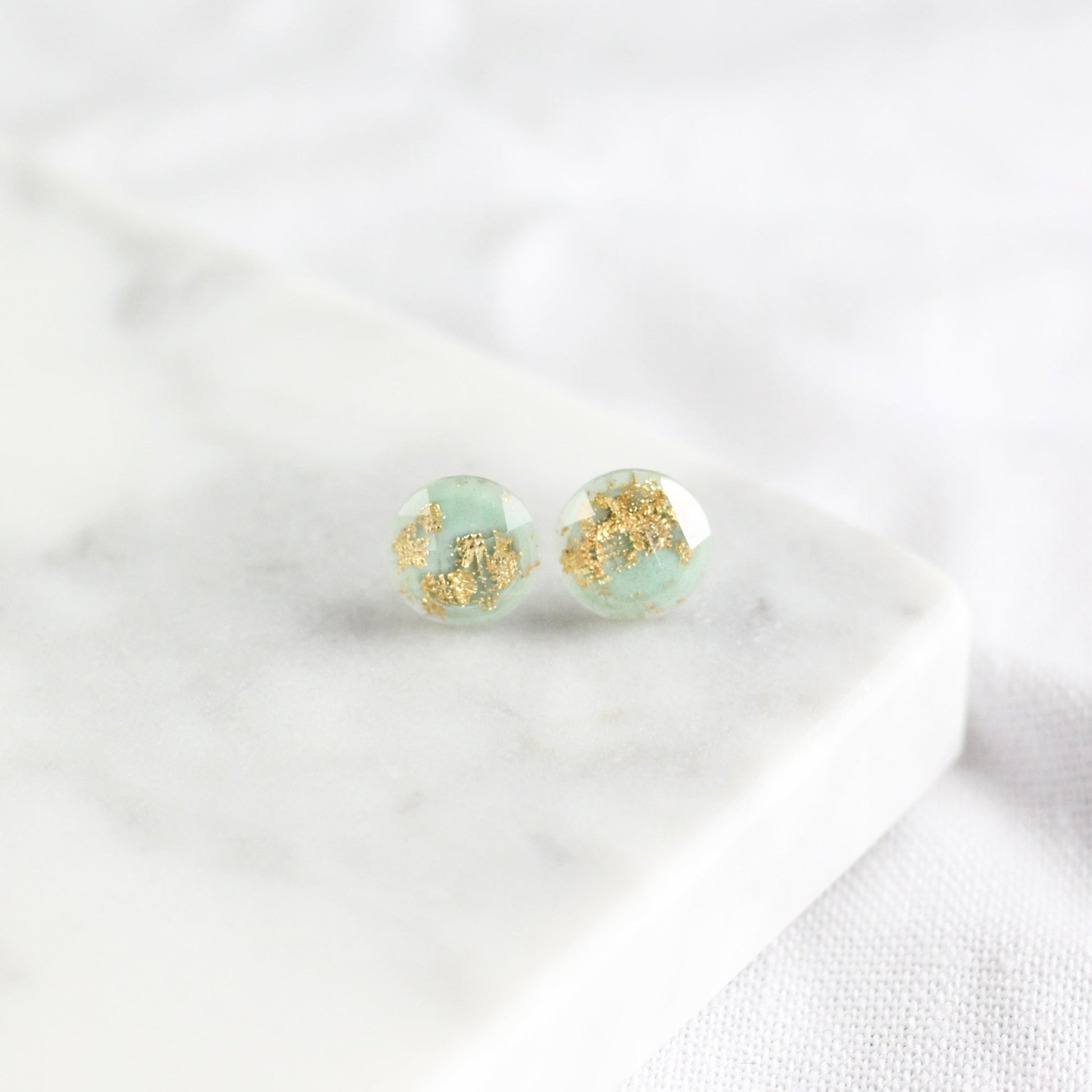These tiny studs feature a mint green, faceted front that has delicate flakes of gold foil and glitter inside. They are the perfect stud for everyday wear or for a special occasion.