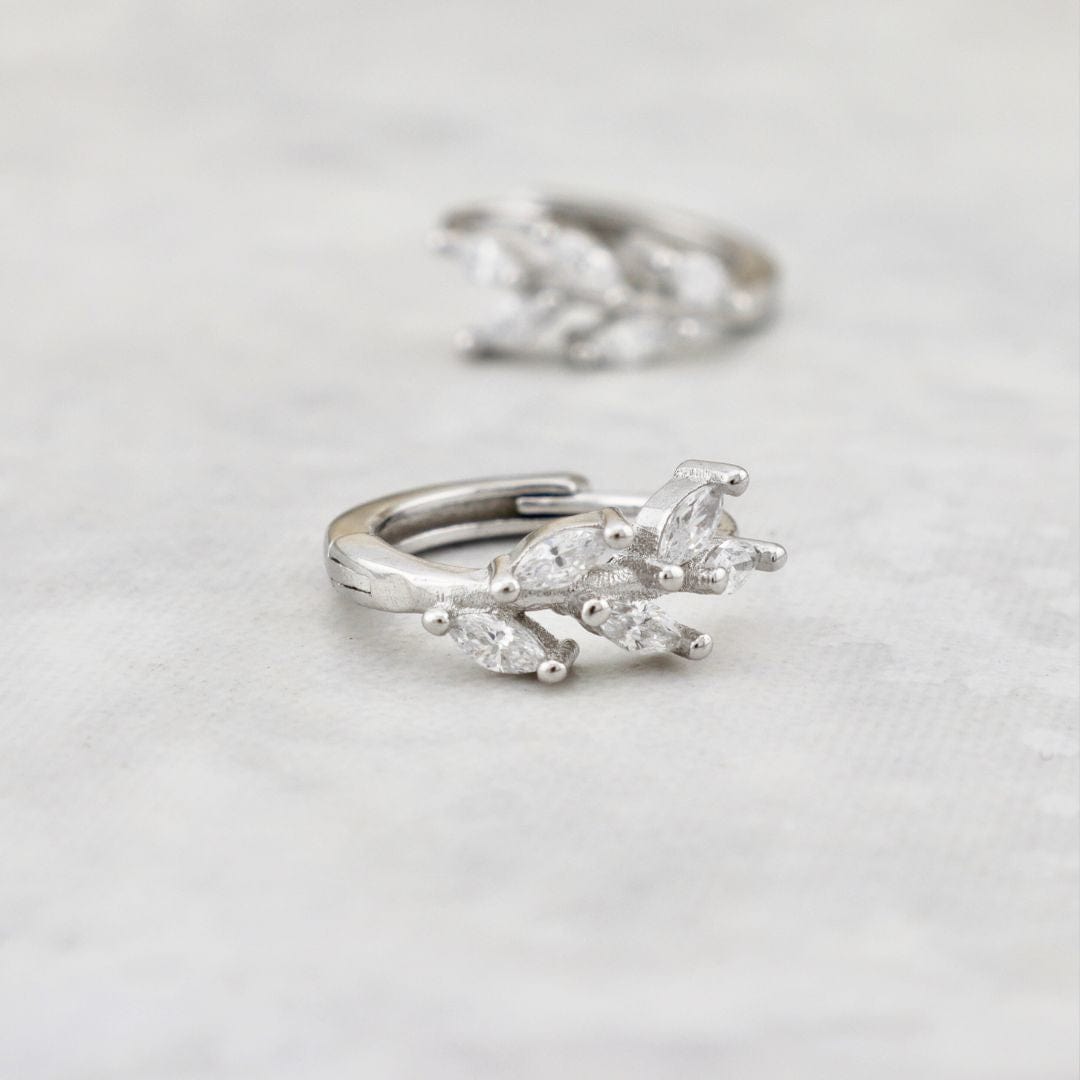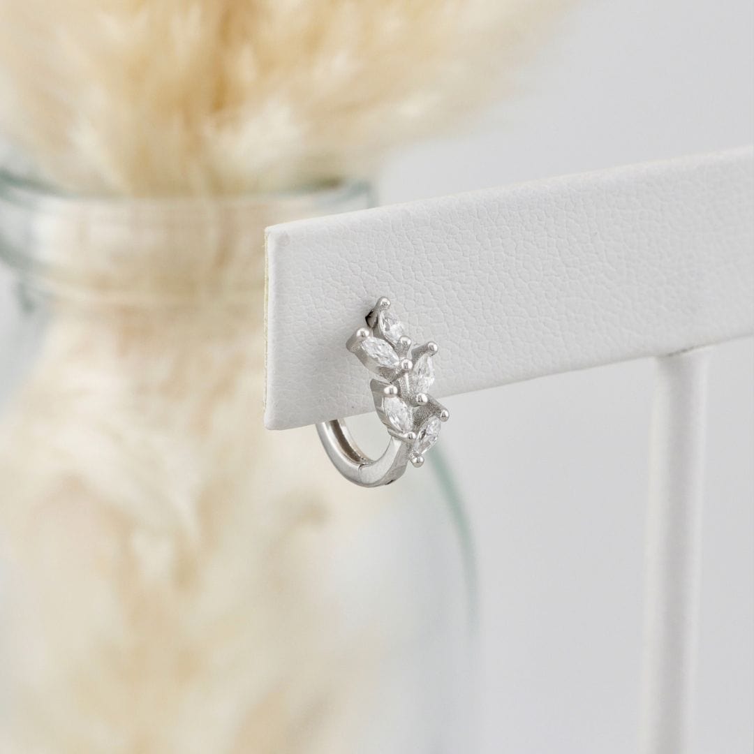 Boucles d’oreilles huggies Marquise en argent sterling : ces boucles d’oreilles élégantes évoquent délicatement la forme d'une branche, tout en restant résolument féminines et étincelantes. Chaque boucle est ornée de cinq pierres taillées en marquise, qui captent la lumière avec éclat. Confectionnées en argent sterling et rehaussées d’une finition rhodium, elles offrent un style raffiné, parfait pour illuminer vos tenues quotidiennes comme vos occasions spéciales.