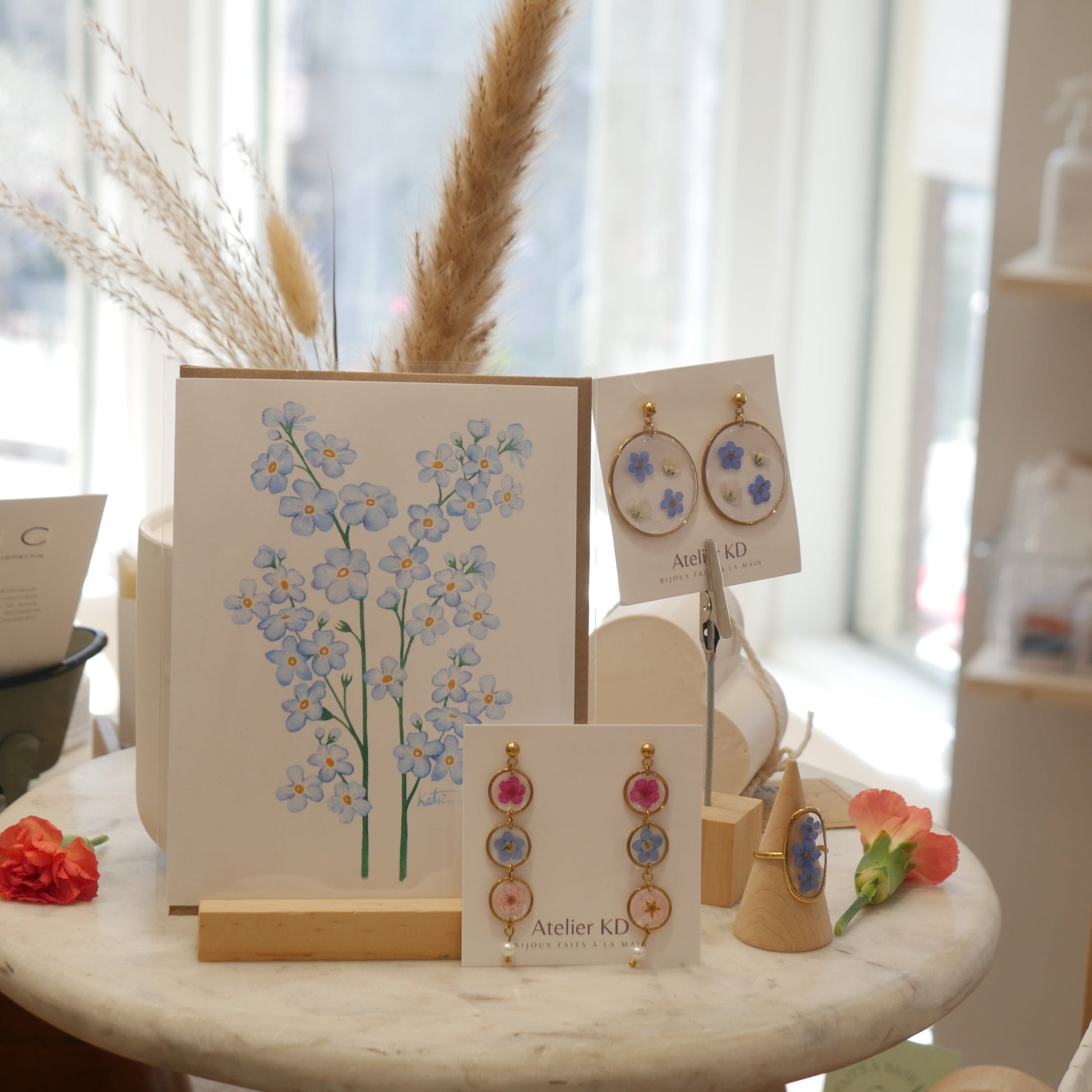 Boucles d’Oreilles en résine incrustées de fleurs myosotis et de fougères, accessoirisé de petite perles d’eau douce.
