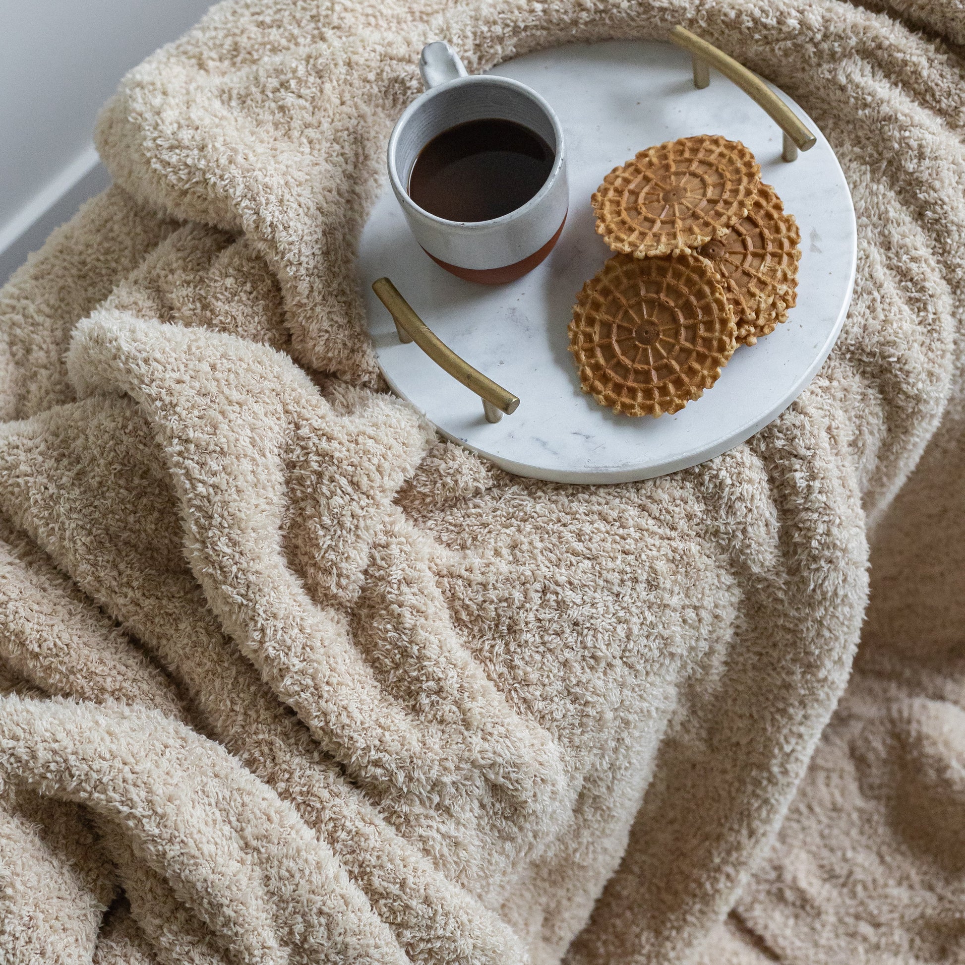 Print: Buffed Beige (a caramel toned beige) Solid Double Layered Print Extended Throw