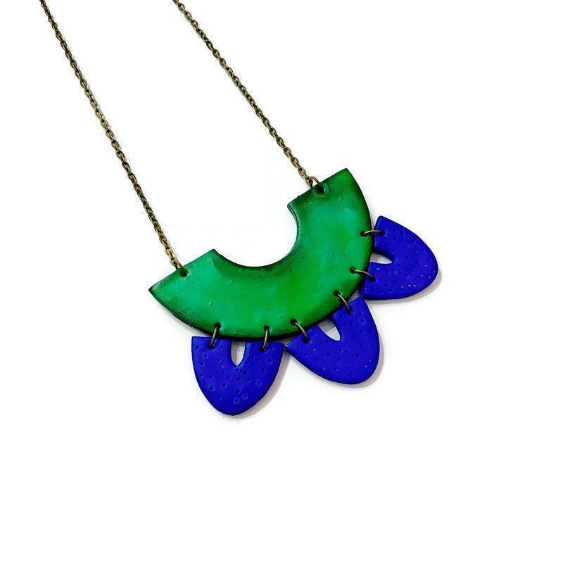 These big statement earrings were handmade from polymer clay and painted green and blue. These earrings are lightweight and very comfortable to wear. Complete the look with a matching statement necklace. The two tone color scheme of this set makes it versatile and unique- it will look great with both causal and more formal attire.