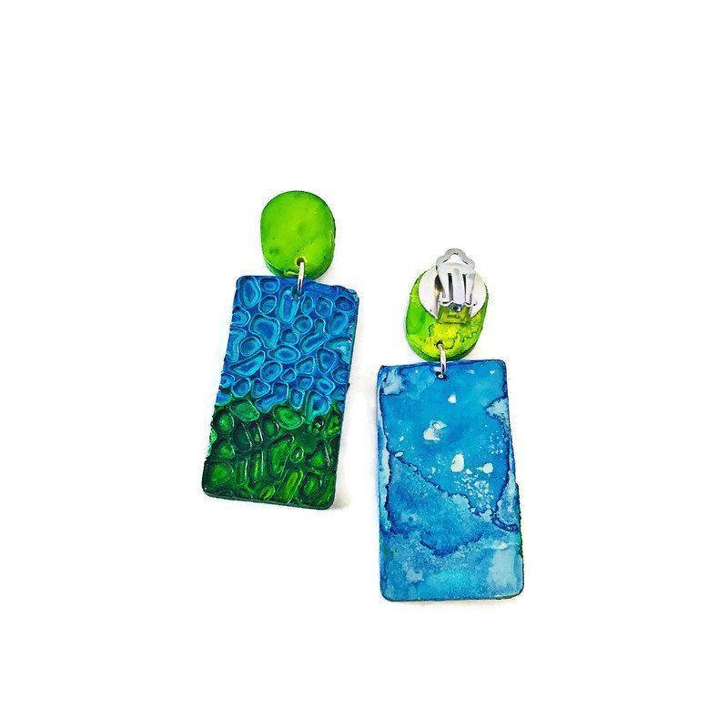 These colorful textured statement earrings feature a unique design and two tone color schemes. These earrings were handmade from polymer clay and hand painted with alcohol ink. The alcohol ink is very vibrant in color and has an undertone of shimmering silver.