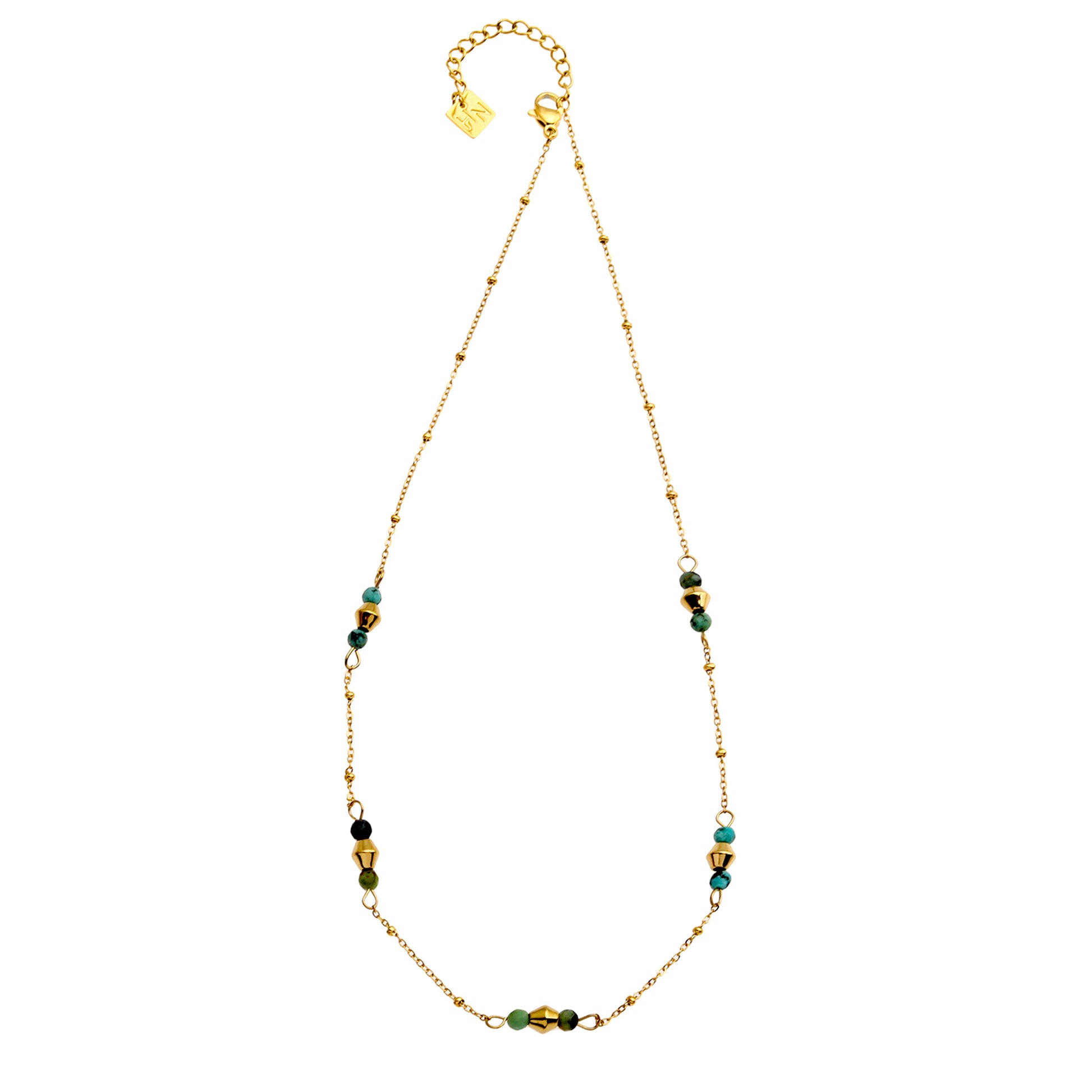 Add some fluid style to your outfit with this boho & vintage influenced necklace. Featuring natural stones & metal beads, this chain can be worn from AM to PM.