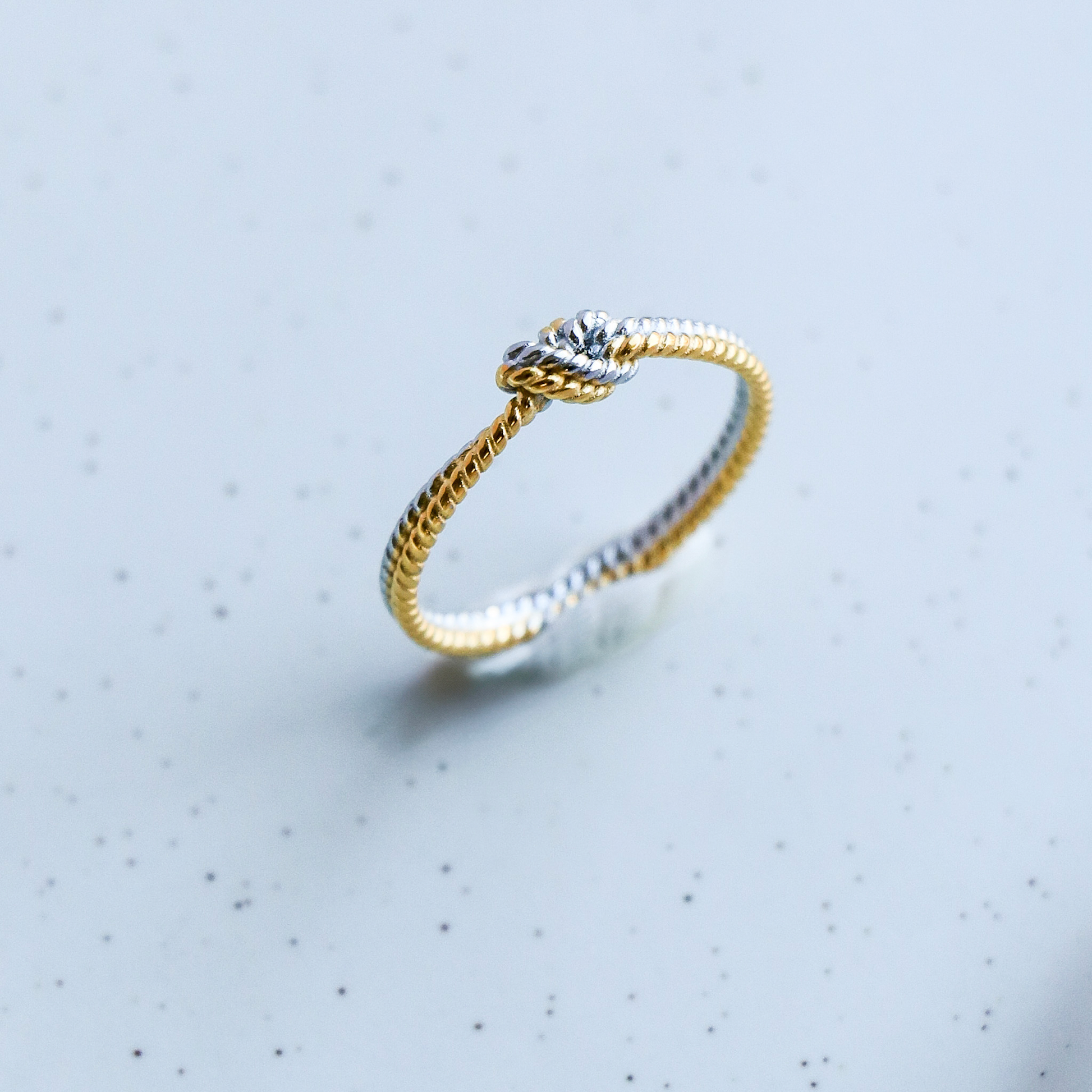 Bague bicolore argent et or avec noeud sur le dessus. Retrouvez une texture lignée et travaillée pour cette bague deux couleurs qui pourra s'agencer avec tous vos bijoux.