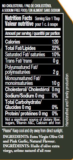 Material: First cold pressed olive oil with natural pink garlic flavor