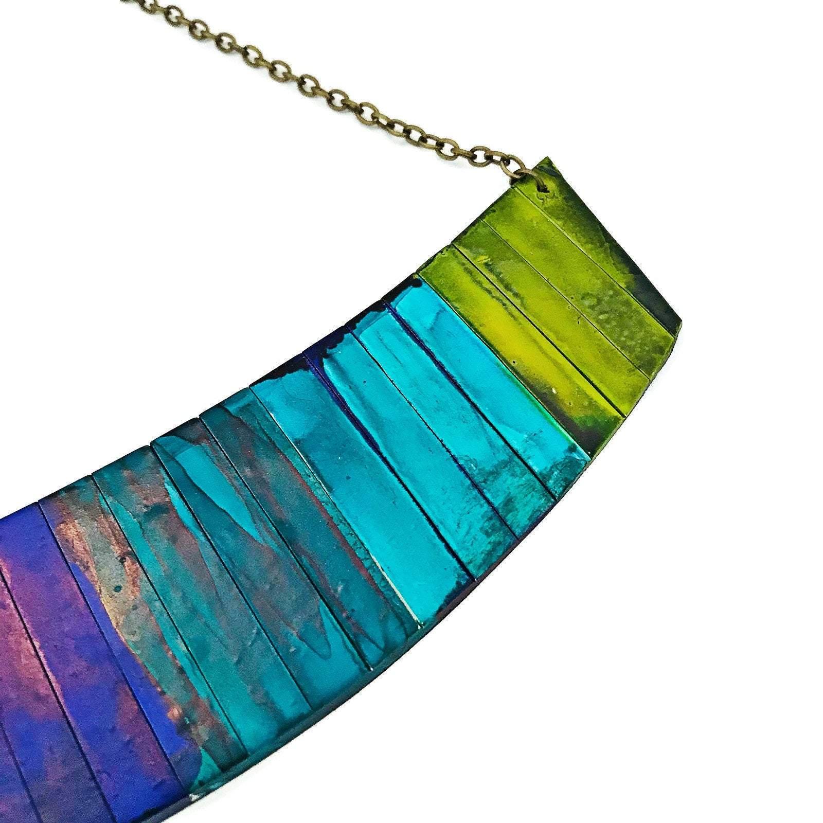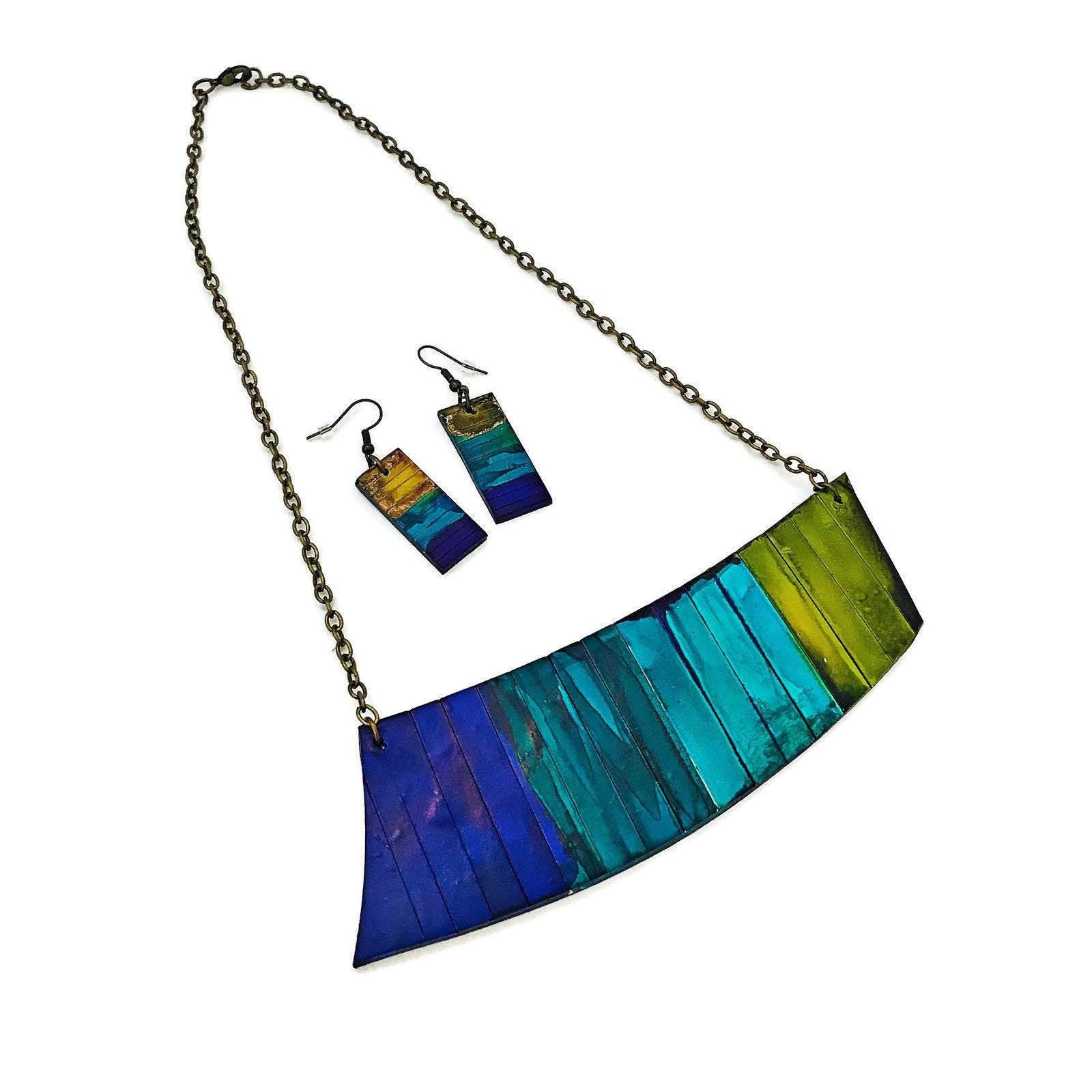 This statement jewelry set has an unique striped design features an ombre blend of colors. The necklace starts on one side with a yellowish green tone and at the other end is a dark cobalt blue. Both the necklace and earrings are lightweight and comfortable because they are handmade from polymer clay. The color was created by painting each piece with alcohol ink.