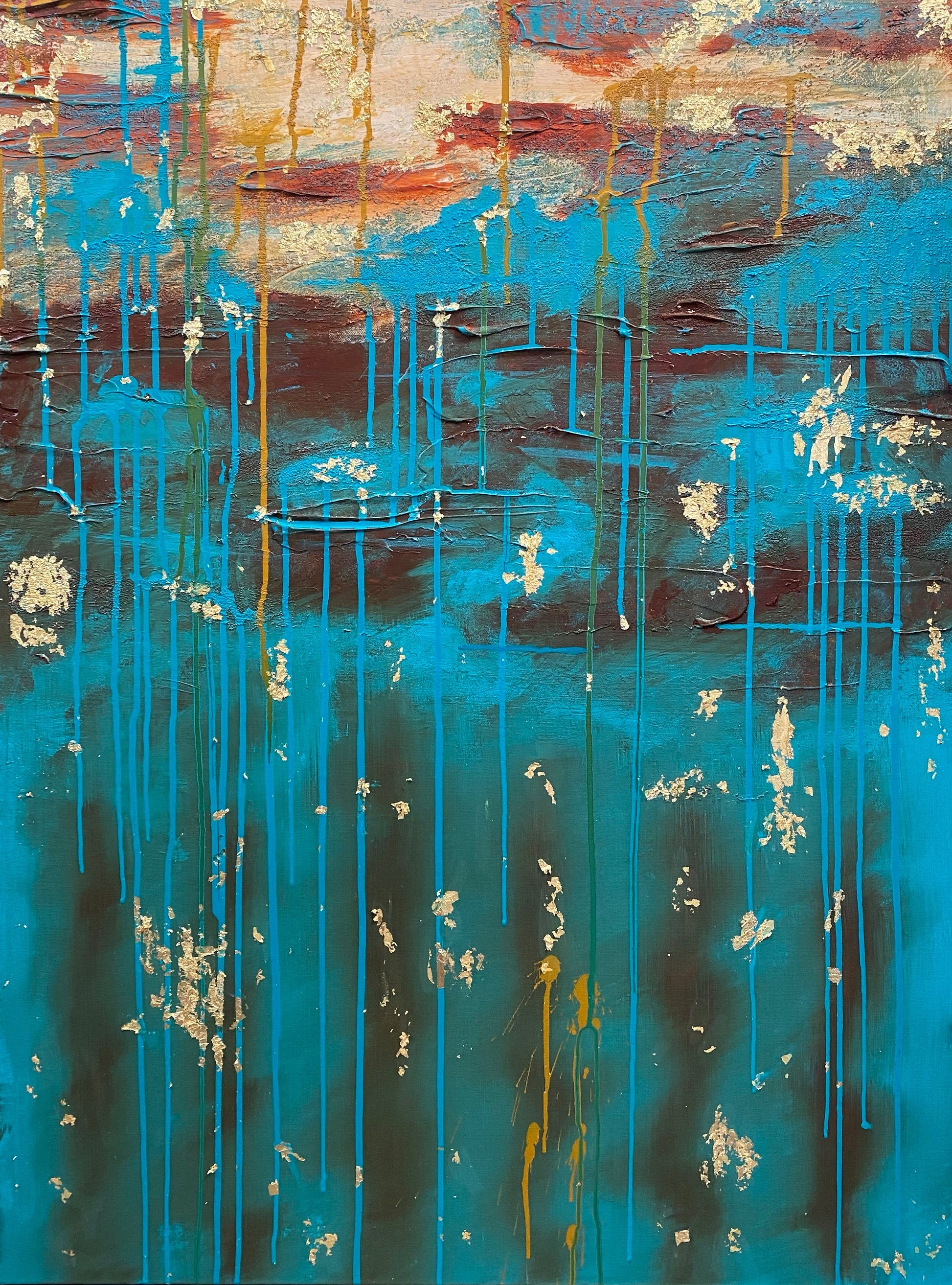 Crackle effects, glass bead and silver and gold leaf contribute to the depth and detail in this abstract painting
