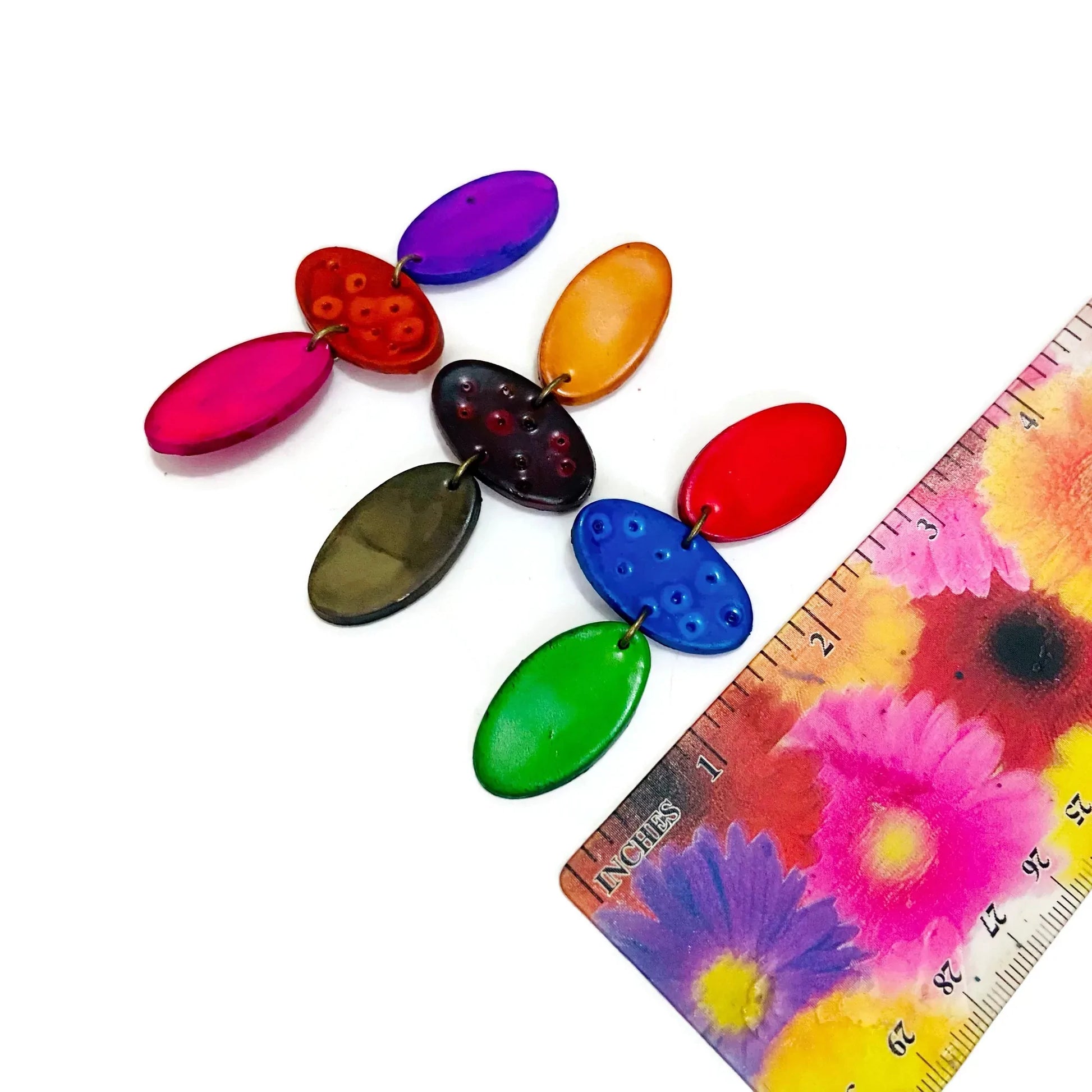 These bright and colorful tri tone clip on earrings were handmade from polymer clay and painted with alcohol ink. They are unique and stylish and bound to make a statement!
