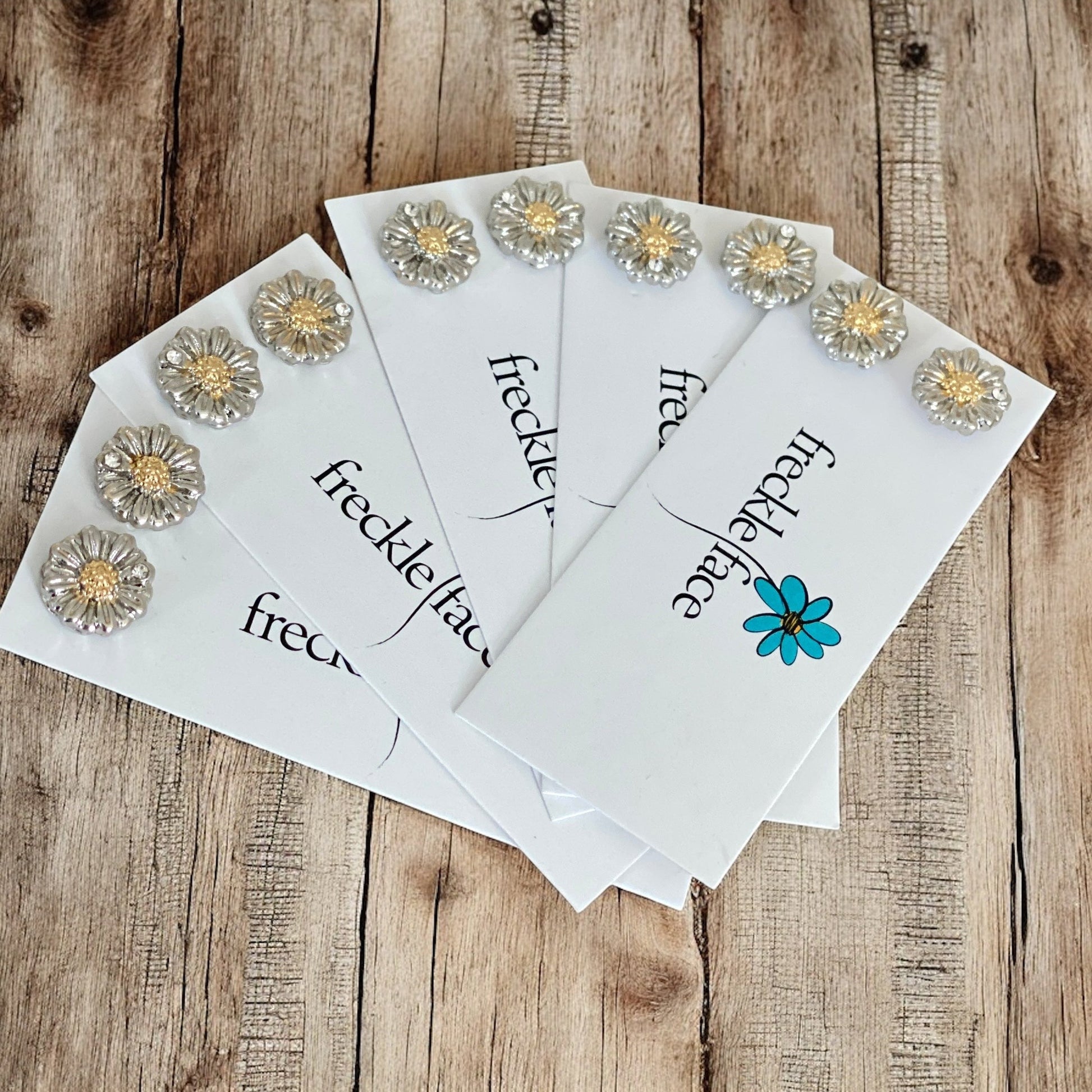 These are the Two Toned Daisy Studs. Adorable 10mm daisy studs featuring silver-tone textured petals with a gold-toned textured center, each adorned with a tiny clear rhinestone. Finished with stainless steel-plated posts for added comfort and of course they come with silicone stoppers to keep the earrings secure while you wear them.