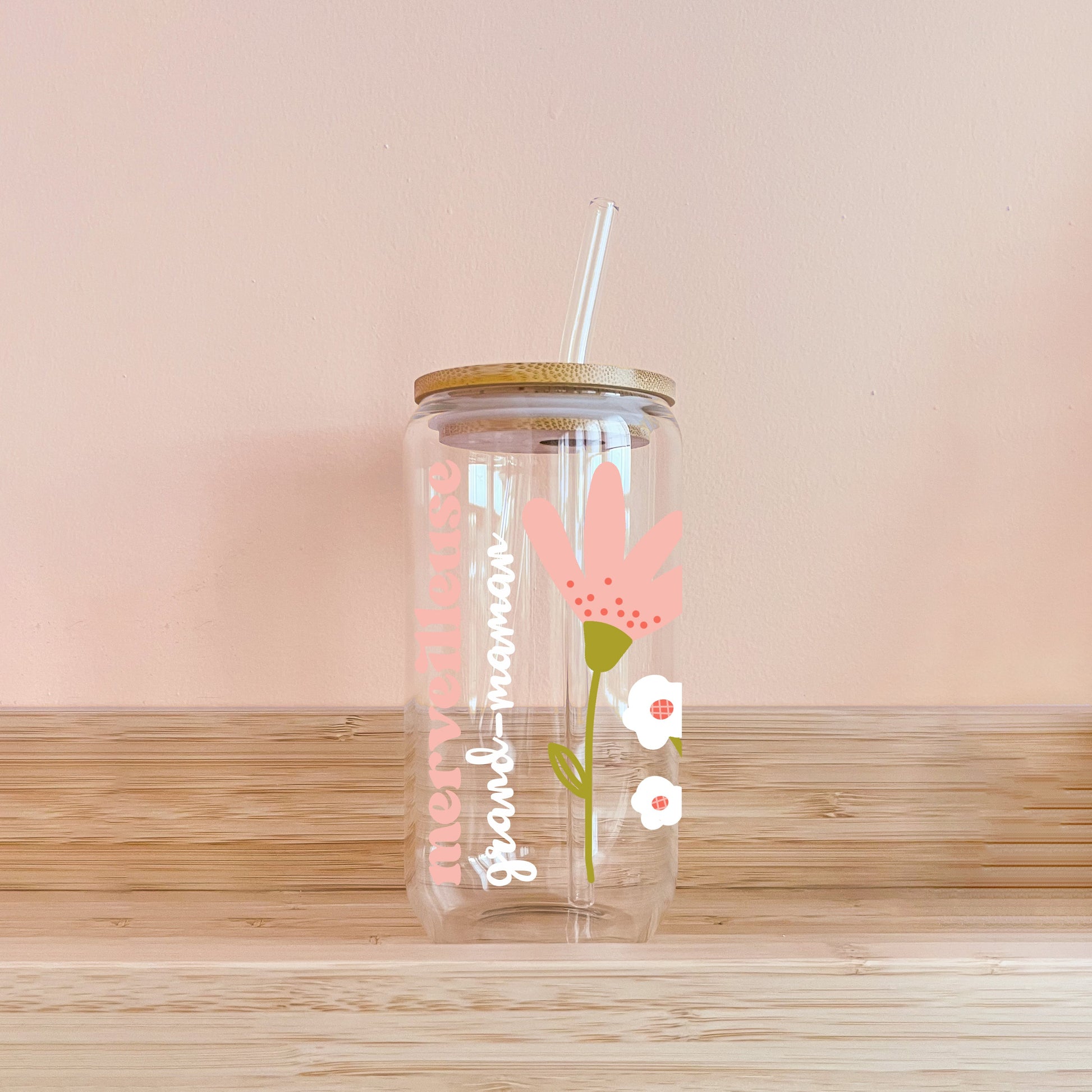 🌸 Verre 16oz avec couvercle en bambou et paille en verre