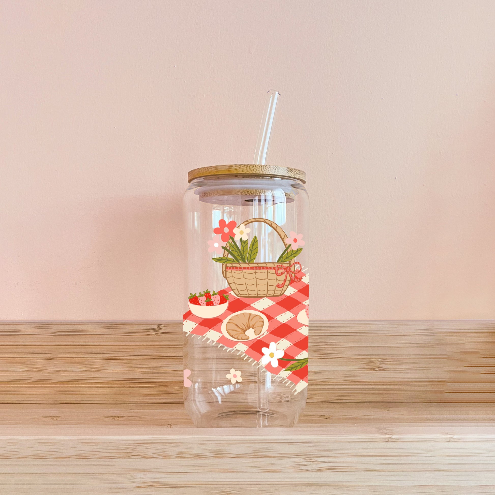 🌸 Verre 16oz avec couvercle en bambou et paille en verre