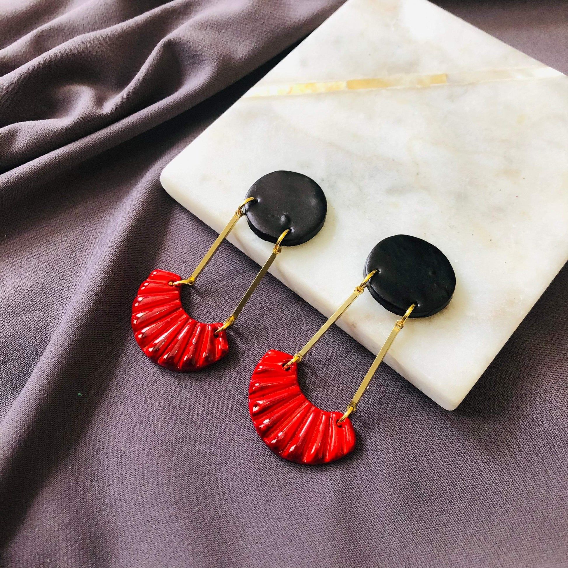 These long statement earrings were handmade from polymer clay and hand painted with alcohol ink. The have a geometric design feature a circle, brass bars and textured fan shape. They are super lightweight and fun to wear! These earrings are lightweight can can be purchased as posts or clip ons.